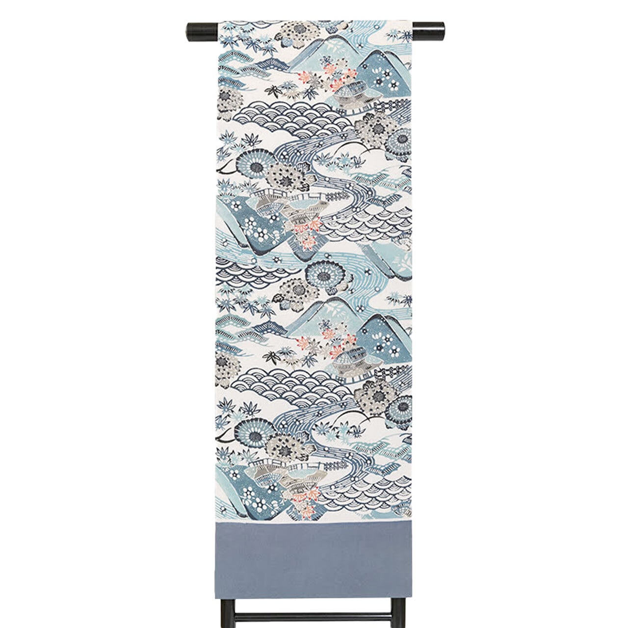 【モダン紅型】名古屋帯(水、山並み、民家、もみじ、菊、笹)